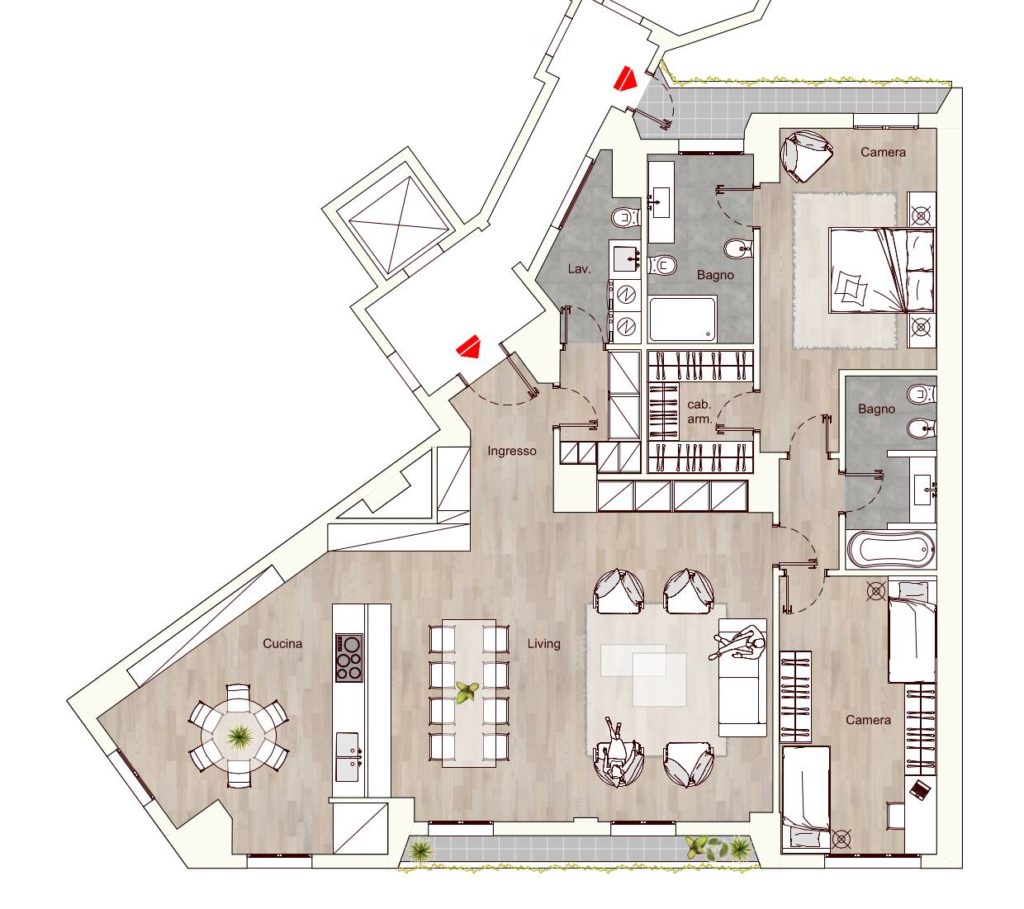 All’ingresso siamo accolti da un salone con una spaziosa zona di conversazione, una zona pranzo e un balcone affacciato sulle chiome degli alberi sottostanti. La cucina, ampia e abitabile, può essere tenuta aperta sul living o separata, secondo le esigenze. La zona notte propone attualmente due spaziose camere da letto – la principale con cabina armadio, bagno en suite e balcone – ma la versatilità e la generosità degli spazi consentono di ricavare agevolmente una terza camera. Un secondo bagno e un funzionale locale lavanderia completano la dotazione di servizi.